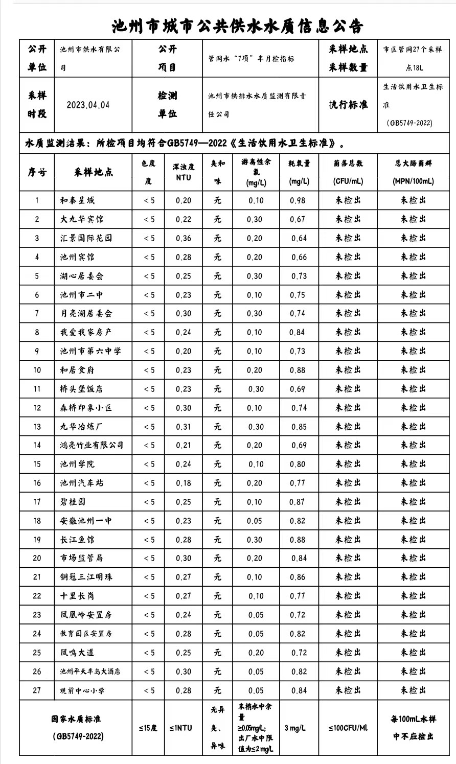 池州市城市公共供水水质信息公告1季度管网水“7项”指