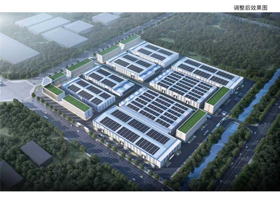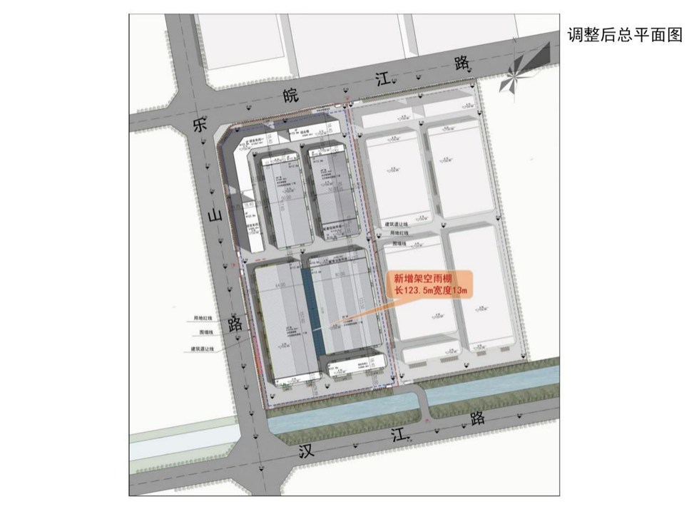 1.1#、2#厂房之间消防道路顶部新增架空雨棚,雨棚长123.5m,宽度13m。