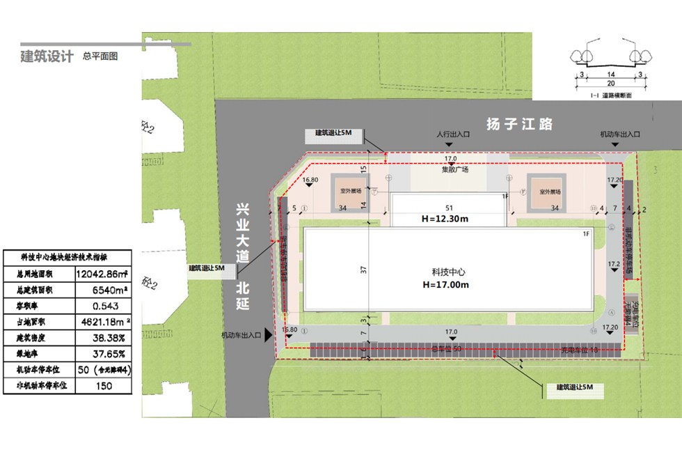 方案主要内容:新建1栋展馆及其配套附属设施,规划总建筑面积6814.02平方米(计容面积6814.02平方米);容积率约0.566,建筑密度约39.6%,绿地率约 36.42%;机动车停车位 50个,非机动车位150个。用地面积约12042.86平方米(合18.06亩,具体面积以实测为准)。